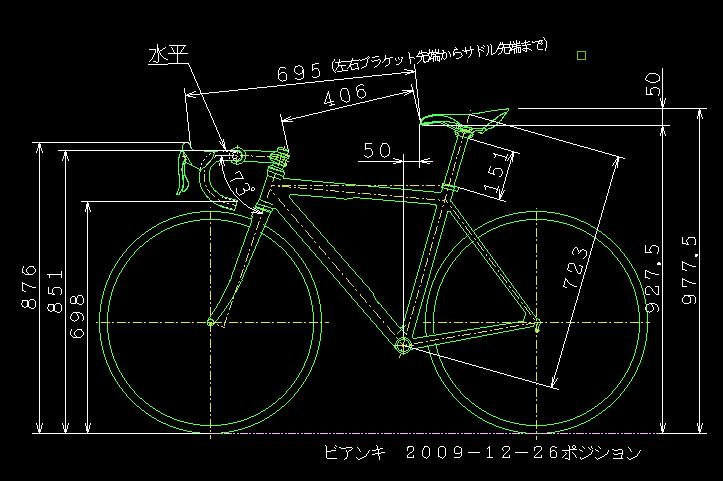 今年もよろしくお願いします。 僕はバイクの寸法をCADで作図して管理しています。(物好きですね) フレームやサドル等のパーツをノギスやメジャーで測定してデータ化しておいて図面 上で組み合わせるので、パーツを変えた時ポジションがどのように変化するかが解り やすいです。 CAD化したのは、去年フレームを予約する時、現状のポジションを変えない為にはど うしたら良いかを検討したのがきっかけで、図面上で手持ちのハンドル、ステム、 シートポストをあれこれ付け変えて検討しました。 結局フレームは諸事情によりお預けになりましたが・・・ 参考までにCADデータをJPEGに変換したものを添付しますね。(解像度が悪いです。 ごめんなさい) そして今年こそフレームを購入予定です。この辺はまた後ほど。 PR